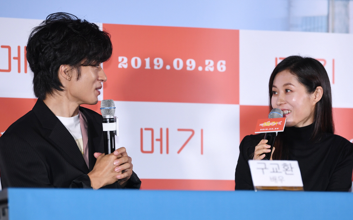 영화 '메기' 언론시사회 및 기자간담회가 17일 오후 서울 용산 CGV에서 열렸다. 배우 문소리와 구교환이 서로를 바라보며 이야기하고 있다.
