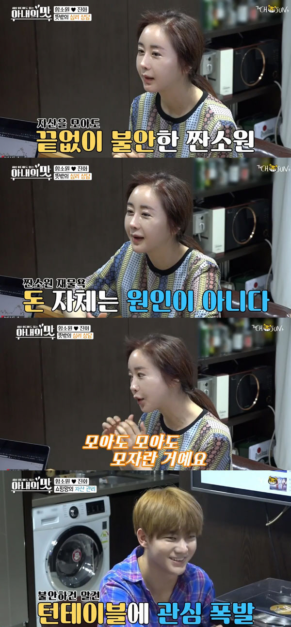 전문가는 "돈 자체가 목표가 아니다. 불안 자체를 조절할 필요가 있다"고 말했다. 뜻밖의 심리 상담이었다. 이때 함소원은 "위험한 상황에 내가 책임을 져야한다는 책임감이 있어서 모아도 모아도 모자란거다"고 말했다. 그러자 전문가는 "지금은 괜찮아도 불안했던 일들만 생각나죠? 본인이 스스로를 힘들게 하는거다"고 말했다.