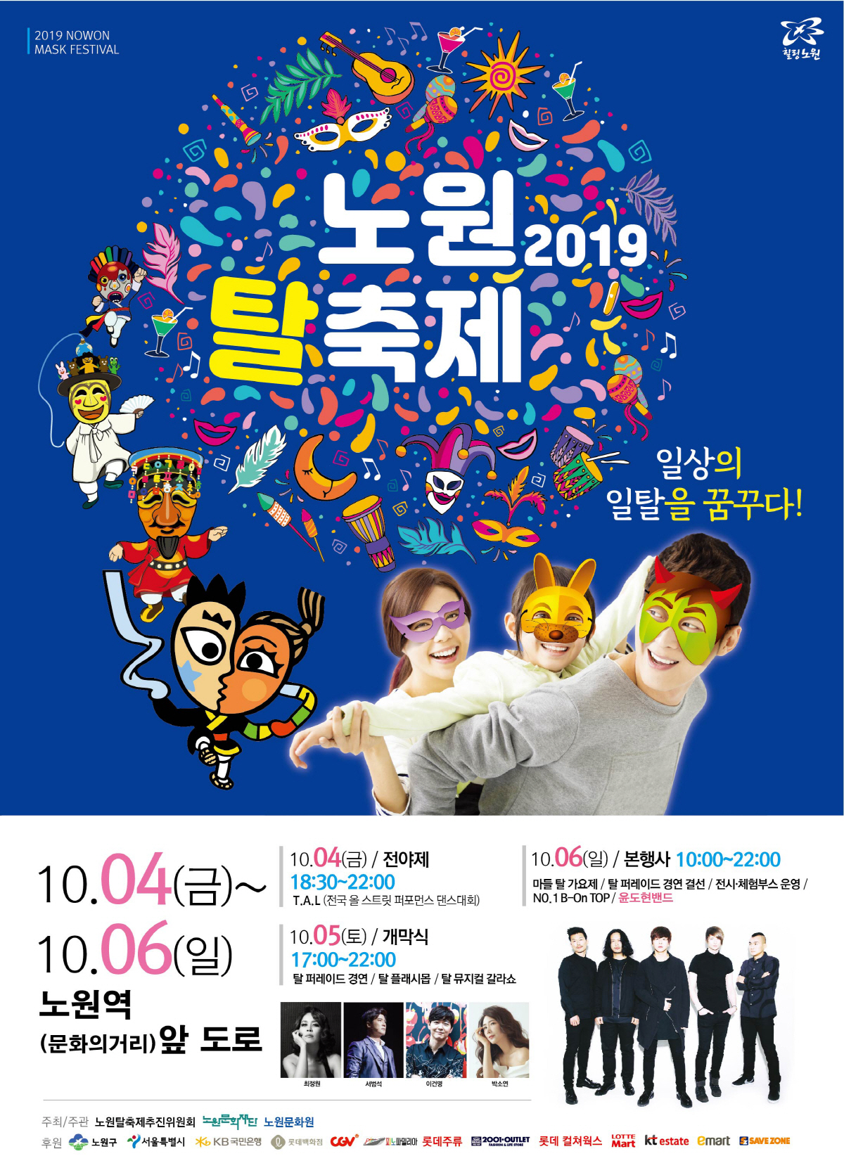 전통과 현대, 춤과 음악, 탈이 어울린 대표적인 주민 참여형 축제인 '2019 노원탈축제'가 오는 10월 4일(금)부터 6일(일)까지 노해로 및 노원 문화의 거리 일원에서 역대 최대 규모로 화려하게 펼쳐진다.