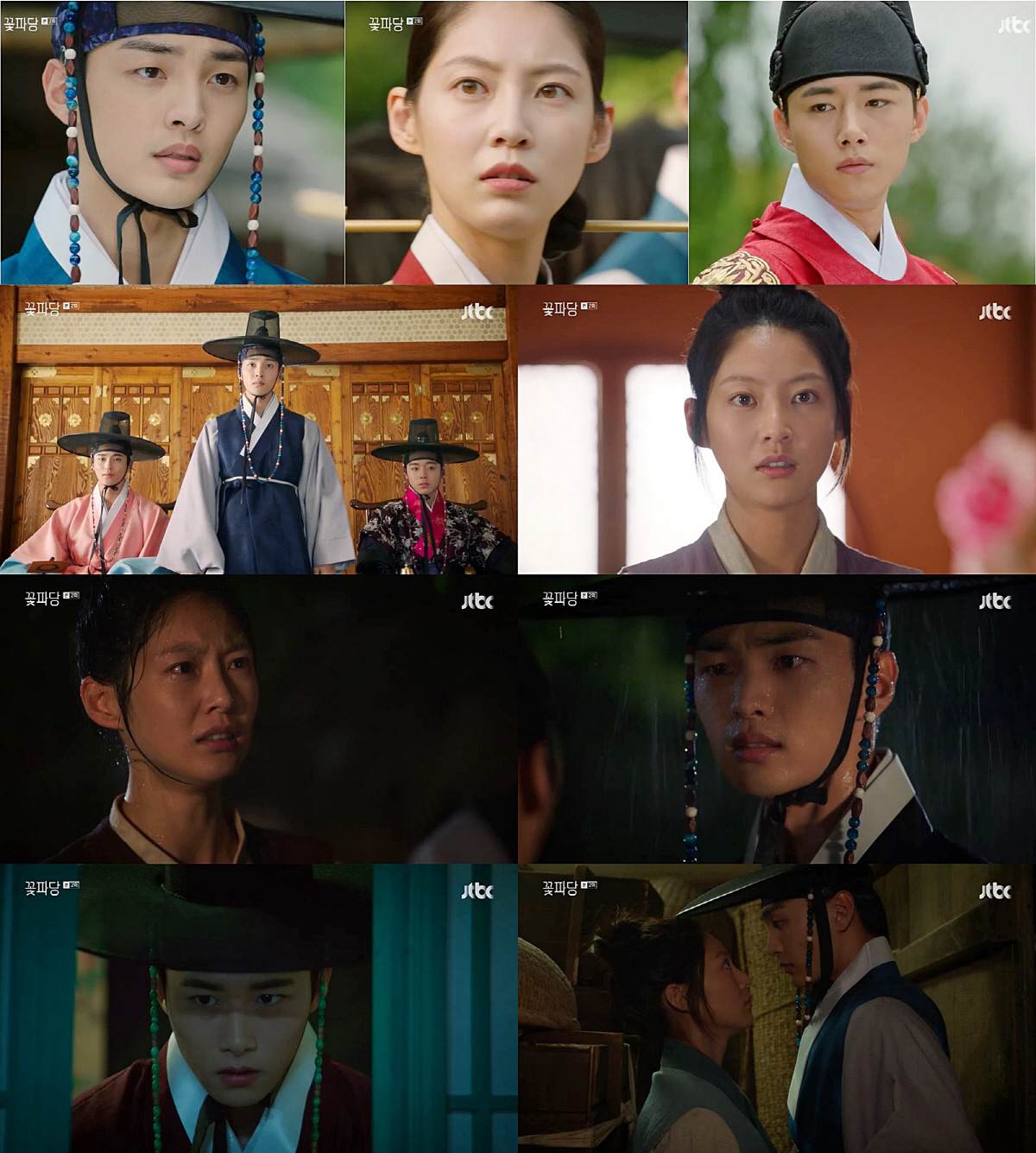 지난 17일 방송된 JTBC 월화드라마 '조선혼담공작소 꽃파당'(극본 김이랑, 연출 김가람, 제작 JP E&M, 블러썸스토리) 2회에서 결국 부부의 연을 맺지 못한 개똥(공승연)과 이수(서지훈). 혼례 당일, 영문도 모른 채 궁으로 끌려간 이수는 자신의 의지와 상관없이 왕위에 올랐고, 마훈(김민재)과 이수를 찾아 헤매던 개똥이는 매파가 되고자 '꽃파당'에 찾아왔다. 그 가운데, 이수와 혼인할 뻔한 여인이 있다는 사실을 알게 된 영의정 마봉덕(박호산)이 개똥이에게 살수를 보내며 위기에 처했다.