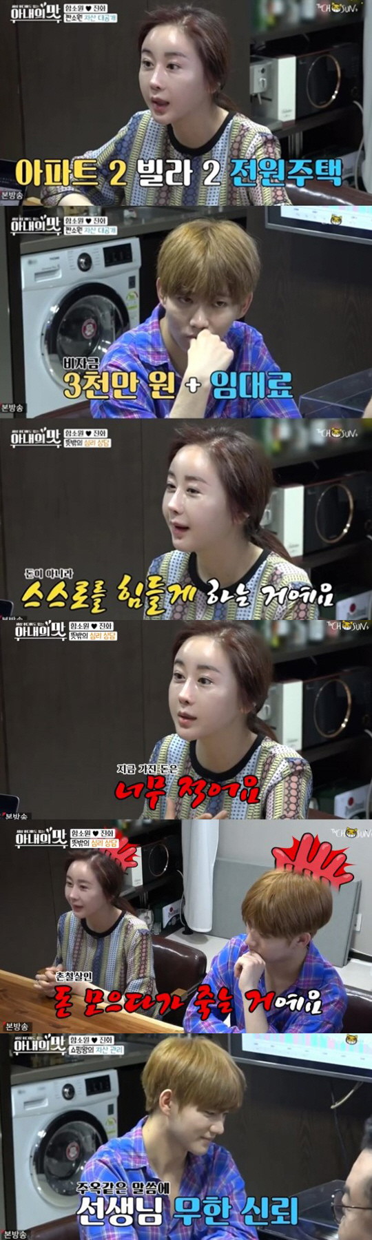 하지만 함소원은 자신의 재산 규모에 만족하지 못하고 있었다. 함소원은 "지금 가진 돈이 너무 적다"면서 "일주일마다 수입을 체크하며 돈 버는 재미에 살았다. 중국 친구들은 한국 와서 건물 사고 간다. 위험하면 내가 책임을 져야한다는 책임감이 있다. 모아도 모아도 모자란다"고 고백했다.