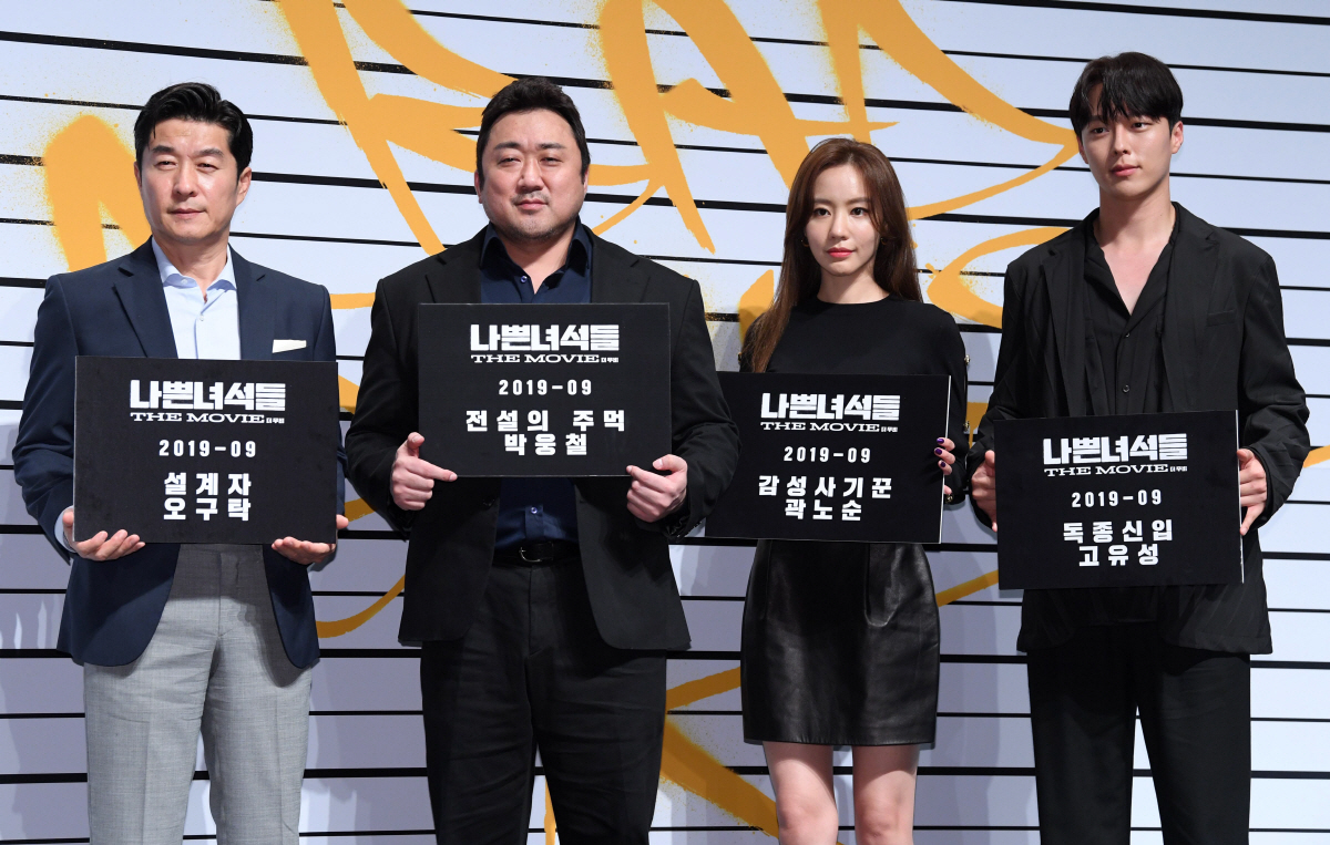 영화 '나쁜 녀석들 : 더 무비'의 제작보고회가 29일 압구정CGV에서 열렸다. '나쁜 녀석들 : 더 무비'는 사상 초유의 호송차량 탈주 사건이 발생하고, 사라진 최악의 범죄자들을 잡기 위해 다시 한번 뭉친 나쁜 녀석들의 거침없는 활약을 그린 범죄 오락 액션으로 2014년 인기리에 방영된 드라마 '나쁜 녀석들'을 모티브 삼아 제작된 영화다. 김상중 마동석, 김아중, 장기용이 포토타임을 갖고 있다. 압구정=허상욱 기자 wook@sportschosun.com/2019.07.29/