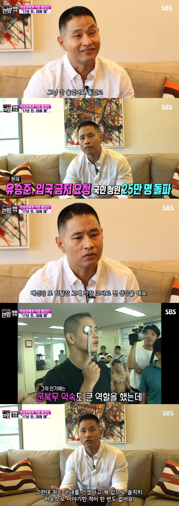 당시 입대 의지를 확인하는 질문에 유승준은 "대한민국 남자라면 다 겪는 일이기에 저한테는 크게 안 좋다고 생각을 안한다", "법을 어긴다든지 편법을 사용한다는 지 생각을 안하고 있다"고 말했다.