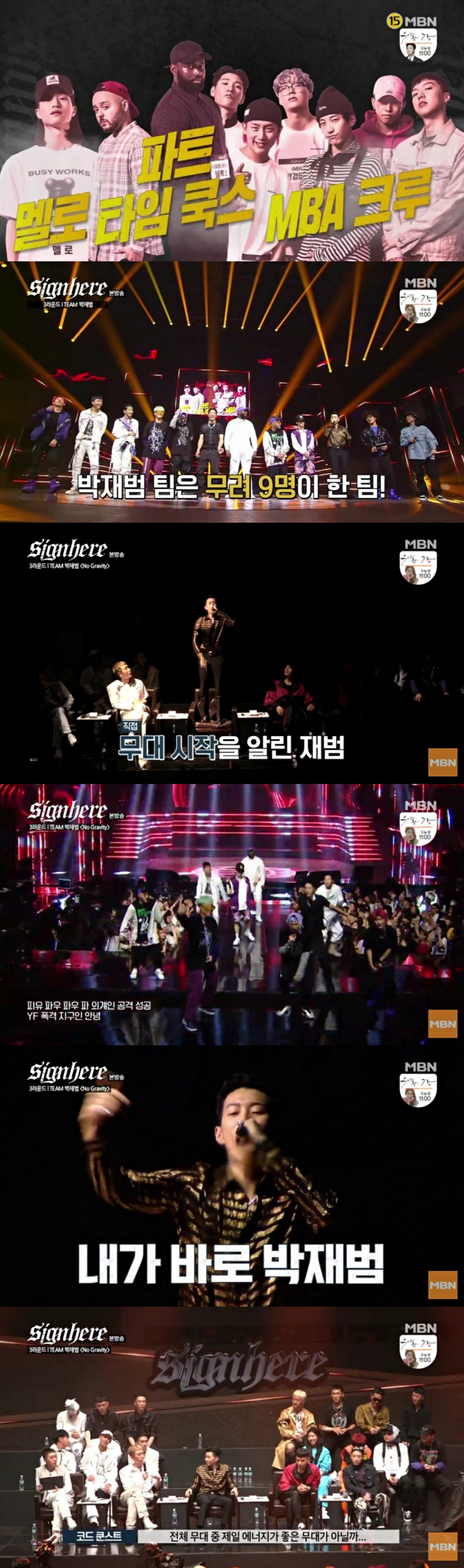 26일 방송된 MBN '사인히어'에서는 드디어 AOMG 심사위원 5인이 프로듀서로 팀을 구성해 배틀을 펼치는 3라운드가 시작된 가운데, '축구단 수준'인 9명의 대인원을 이끌게 된 박재범의 모습이 그려졌다. 박재범이 2라운드 개별 순위 1위, 2위인 멜로와 파트 타임 쿡스를 팀원으로 맞이해 의논을 하던 중, 특별 심사위원들의 결정으로 패배 팀에서 부활한 6명의 MBA 크루가 들어왔다. 박재범은 이들을 매우 반갑게 맞이했지만, 9명이나 되는 인원 때문에 파트 분배가 심각한 문제로 떠올랐다.