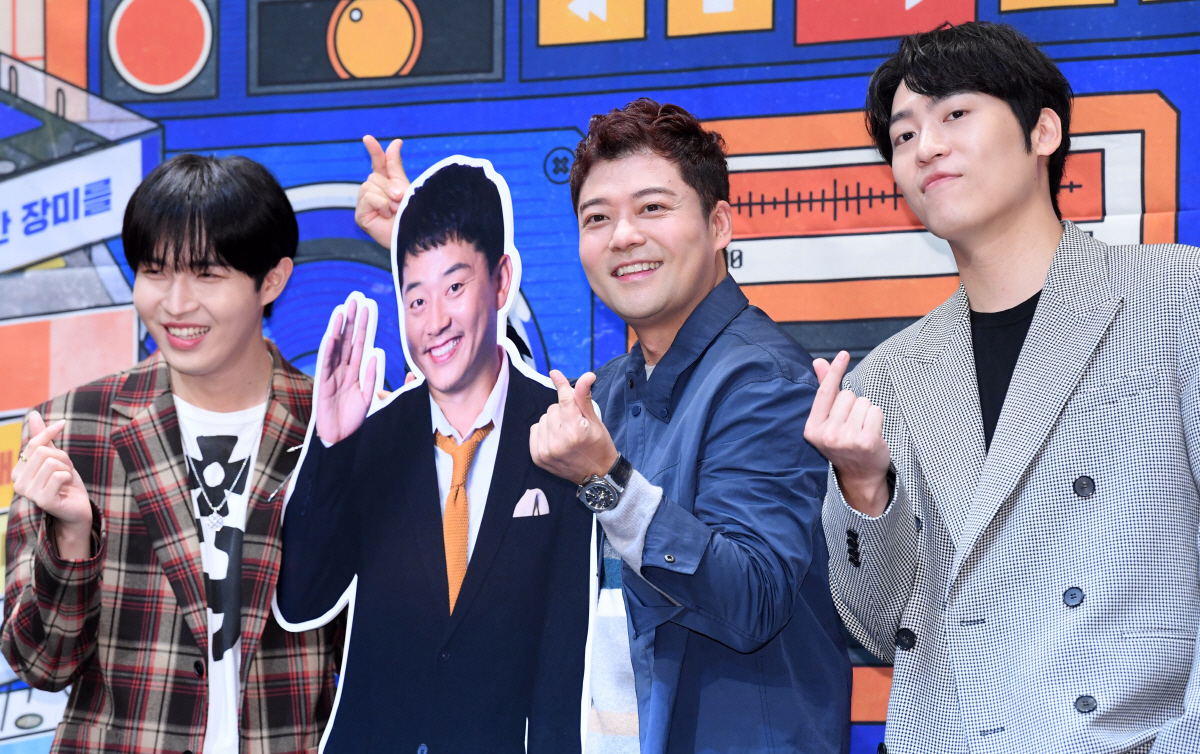 김재환, 전현무, 존박이 2일 오전 서울 구로구 신도림 라마다 호텔에서 진행된 tvN '수요일은 음악프로' 제작발표회에 참석해 포즈를 취하고 있다. '수요일은 음악프로'는 잊었던 명곡, 숨은 명곡, 몰랐던 신곡들을 토크, 게임, 야외 버라이어티 등 다양한 예능 포맷으로 즐길 수 있는 예능 프로그램으로 오늘 밤 11시에 첫 방송된다. 신도림=허상욱 기자 wook@sportschosun.com/2019.10.02/