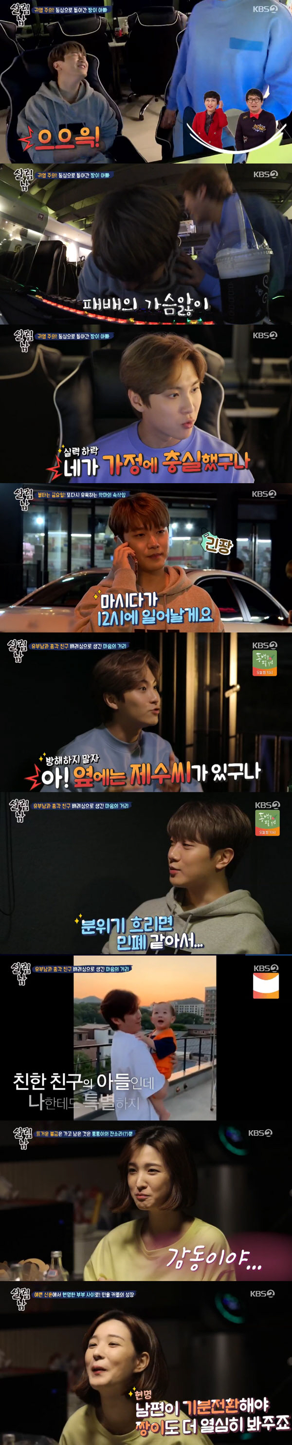 최민환은 "집에 있다 보면 친구들 만나서 이야기를 하고 싶다. 근데 만나면, 나는 근황이 아이 돌보는 것 밖에 없다. 결혼하기 전에 다른 사람들이 아이를 자랑하는 게 내 눈에는 마냥 좋아 보이진 않았다"고 털어놨다. 그때 송승현은 "안 한게 이 정도구나?"라면서도 "나는 듣기 좋다. 친한 친구의 아들인데, 다른 아이 보다 바라보는 느낌이 다르다"고 말했다.