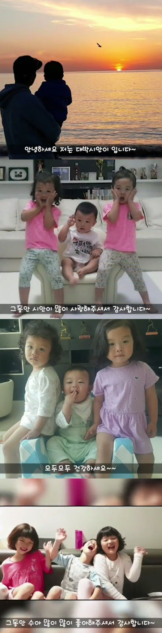 또한 설아, 수아, 시안이의 음성이 담긴 영상과 아이들의 사진을 공개했다. 영상에서 시안이는 "그동안 시안이 많이 사랑해주셔서 감사합니다. 대박 시안이 못 본다고 너무 걱정하지 마세요"라고 인사했다. 설아는 "너무 슬프지만 안 울 거예요. 그러니까 모두 울지마세요. 사랑해요"라고 말했으며, 수아 역시 "그동안 수아 많이 많이 좋아해주셔서 감사합니다"라고 인사를 전했다.