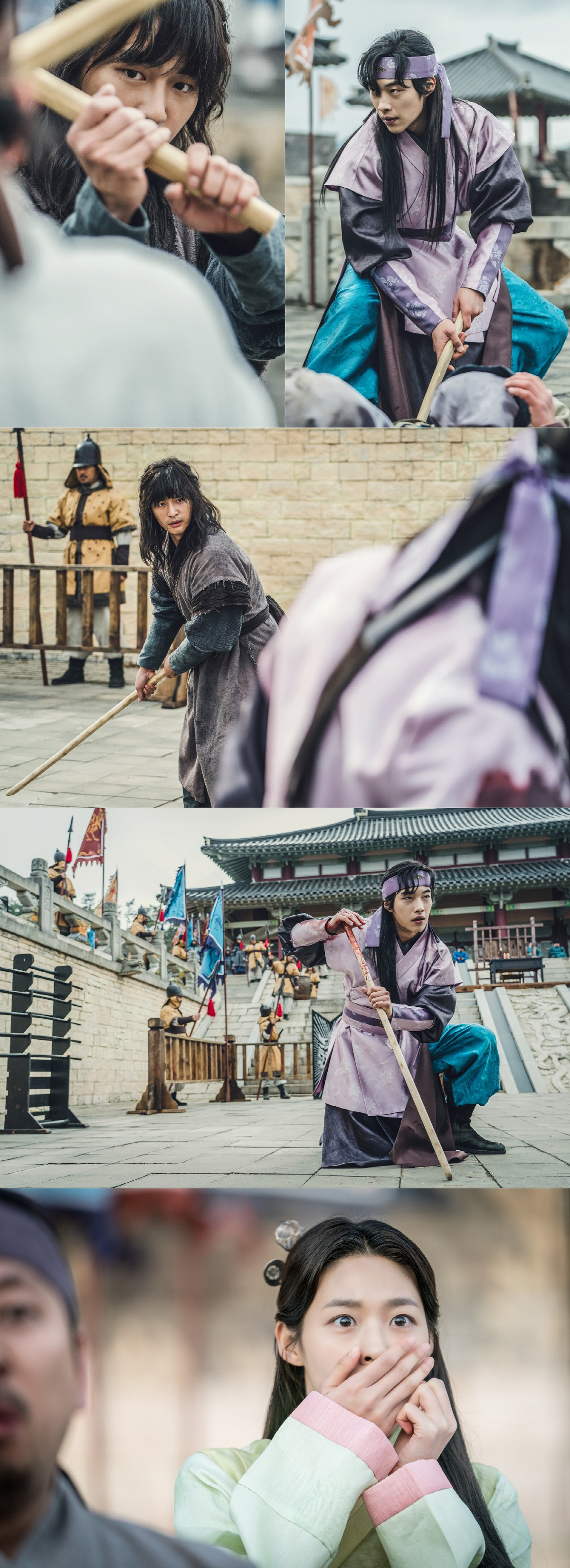 그런 가운데 공개된 사진 속 서휘와 남선호의 숙명적인 대결이 궁금증을 자극한다. 둘도 없는 친우였으나 인생을 뒤바꿀 무과 과시를 두고 격돌하는 서휘와 남선호. 격렬하게 부딪히는 두 사람의 모습은 무과 과시가 이들에게 어떤 의미인지 보여준다. 팽형(죄인을 끓는 물에 넣는 형벌)인의 핏줄이라는 현실을 바꿀 마지막 기회를 잡은 서휘와 형의 몫까지 짊어진 얼자의 운명을 벗어나기 위해 장원을 놓칠 수 없는 남선호. 서로를 넘어야만 하는 두 사람의 눈빛에서 뜨거운 결의가 느껴진다. 서휘는 지친 기색이 역력하나 끝까지 목검을 놓지 않고, 남선호 역시 피를 흘리면서도 물러서지 않는다. 그런 둘을 바라보며 놀란 한희재의 얼굴은 이들 앞에 펼쳐질 심상치 않은 운명을 예상케 한다.