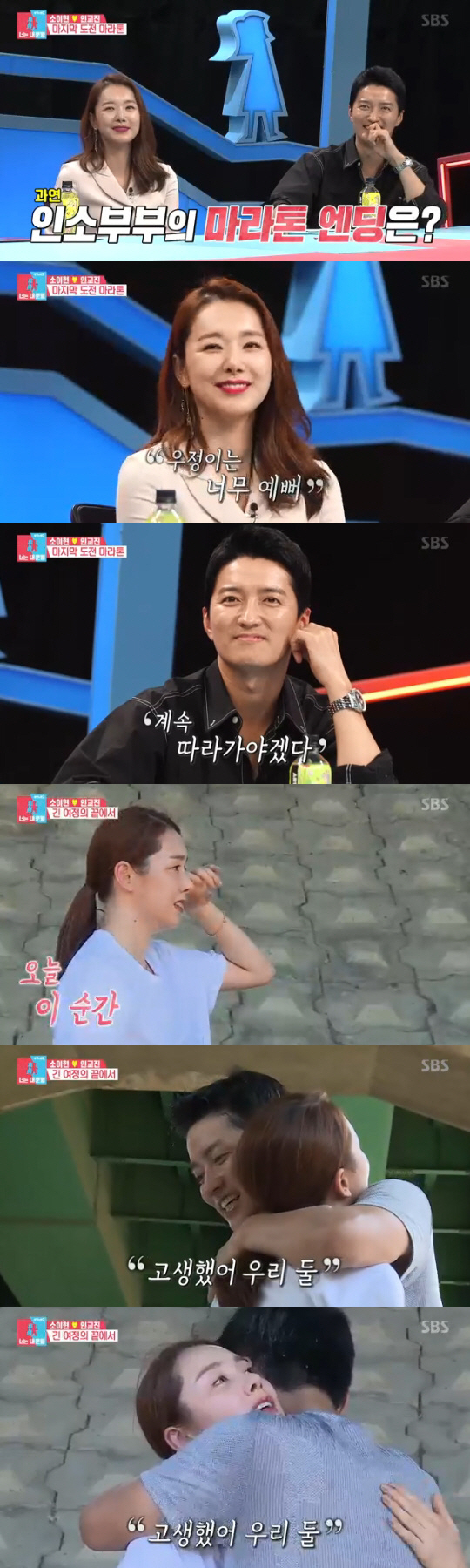 다시 달리기를 시작한 두 사람. 소이현은 "오빠가 등에 손을 대니까 힘이 나는 것 같다. 건전지 같다"고 말했고, 이에 인교진은 "그럼 펴생 대줘야겠다"며 든든하게 말했다. 결승점까지 남은 거리는 500m. 인교진은 "나랑 살면서 제일 행복했던 순간이 있냐"고 물었고 소이현은 "오빠랑 결혼했던 날, 인하은 인소은 낳은 날"날을 꼽았다. 인교진은 "지금이 제일 행복하다. 하루하루 신기록 경신하고 있지 않냐"고 말했다. 10km 완주에 성공한 소이현은 울컥한 듯 보였고, 이에 인교진은 소이현을 따뜻하게 안아줬다.