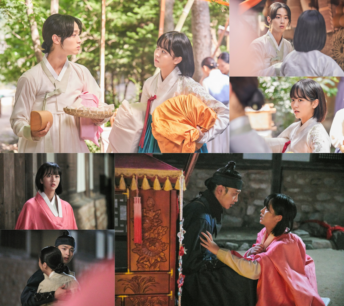 함께 공개된 또 다른 사진에는 달콤 살벌했던 낮의 풍경과 사뭇 다른 두 사람이 포착돼 긴장감을 높인다. 검은색 무복을 차려입은 녹두는 낯선 여인을 품에 끌어안고 있는 모습. 그런 두 사람을 바라보는 동주의 흔들리는 눈빛과 당황한 표정이 역력한 녹두가 궁금증을 더한다. 이어진 사진 속 위험에 처한 듯한 녹두와 동주가 시선을 사로잡는다. 걱정 어린 눈빛을 나누는 녹두와 동주, 과연 이들에게 어떤 위기가 기다리고 있을지 궁금증을 높인다.