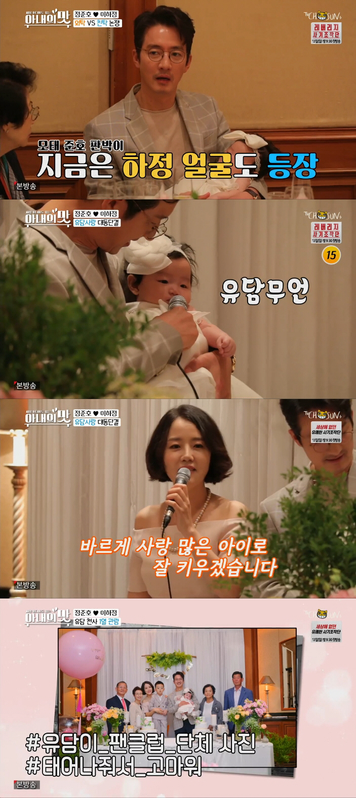 이후 한숨 자고 일어난 유담이를 안아 든 시어머니는 이하정에게 소중한 아이를 낳아준 고마움을 전했다. 이어 양가 부모님은 각각 어렸을 적 정준호, 이하정과 유담이가 판박이라며 원조 자식바보 대결을 펼치는, 웃음꽃 피어나는 훈훈한 시간을 보냈다.