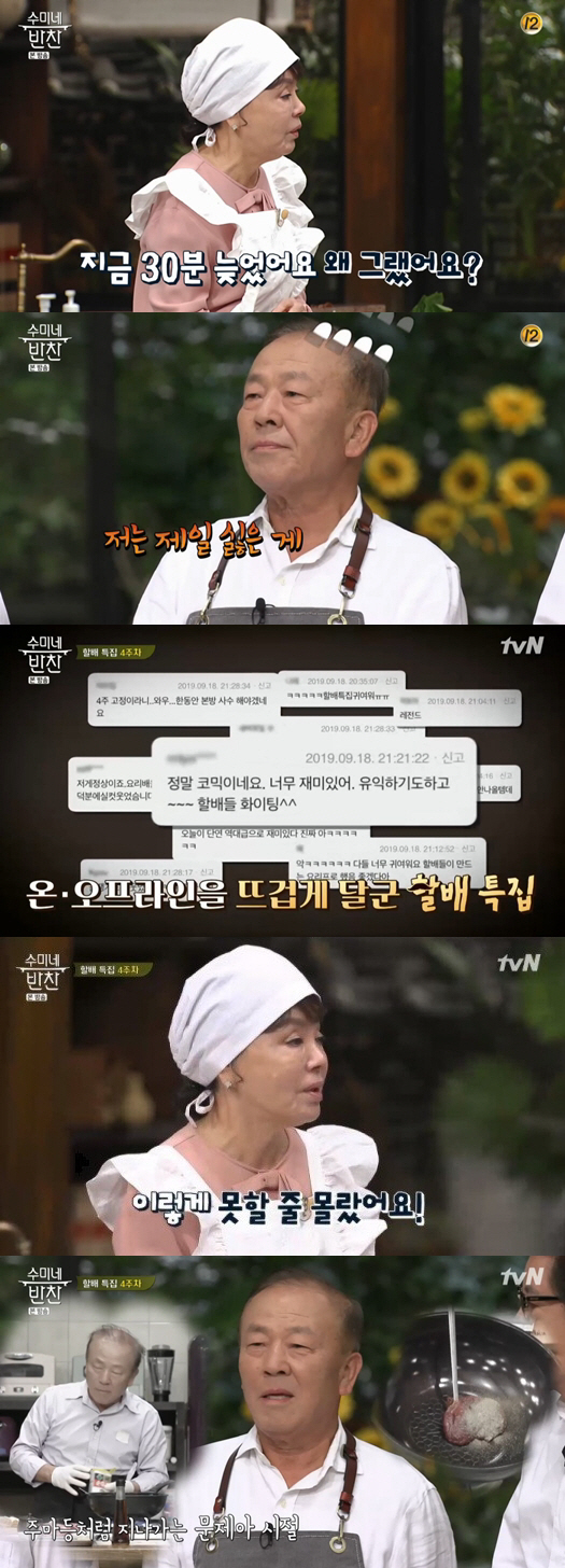 [스포츠조선 남재륜 기자] tvN 예능 '수미네 반찬'에서 김수미가 할배들의 요리 과외를 맡은 소감을 밝혔다.