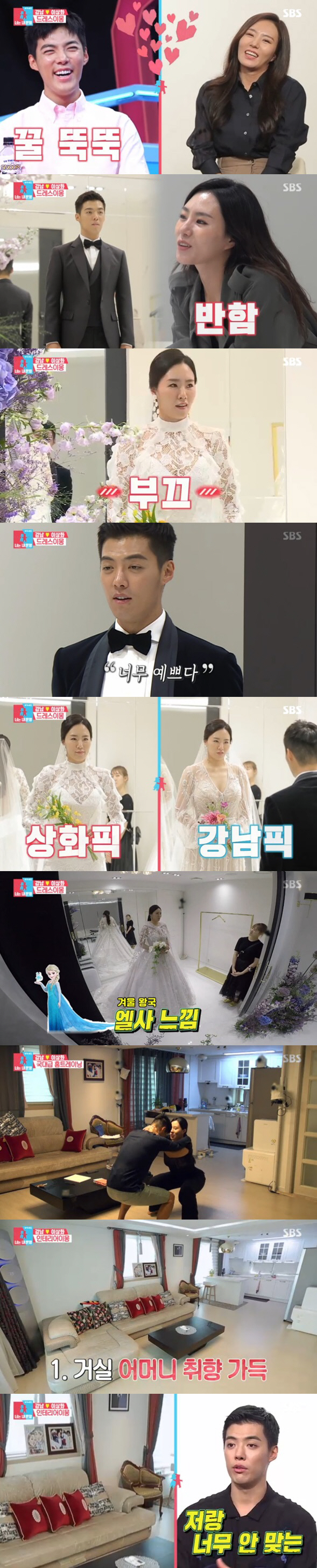 하지만 두 사람은 결혼식의 꽃인 웨딩드레스를 두고 '동상이몽'을 보였다. 강남은 벨라인의 풍성한 드레스를, 이상화는 보디라인이 강조되는 머메이드라인의 드레스를 원한다고 밝힌 것. 이상화는 머메이드라인 "몸의 선이 드러나는 드레스를 입고 싶다. 나도 예쁘다는 걸 보여주고 싶다"고 말했지만, 강남은 "벨라인을 입었으면 좋겠다"고 의견을 제시했다.