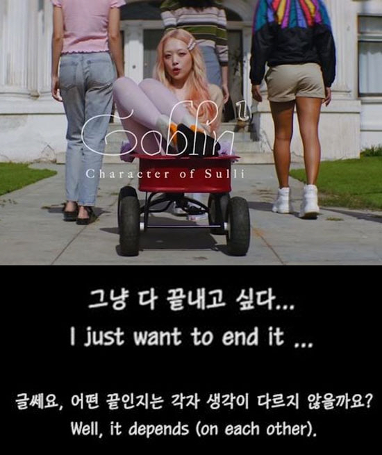 또 설리는 "내가 뭘 잘못했나?", "그냥 다 끝내고 싶다…그런 생각을 해요", "'끝'이요? 어떤 끝인지는 각자 생각이 다르지 않을까요?"라는 의미심장한 말을 남긴 뒤 노래를 시작한다.