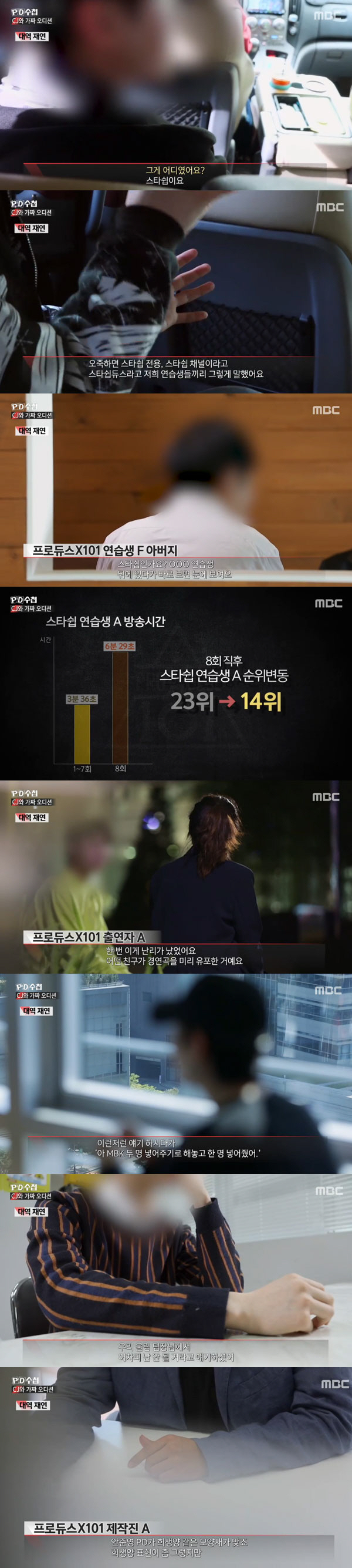 연습생들은 방송 분량에 따라 23위의 연습생이 14위까지 순위가 올랐다. 출연자 A씨는 "한 연습생은 모든 예고에 거의 다 나온다. 방송에 무조건 못 해도 5분, 10분 씩은 무조건 나온다. 저희 사이에서도 '저건 너무 심한거 아니야?'이런 말이 나왔다"고 털어놨다.