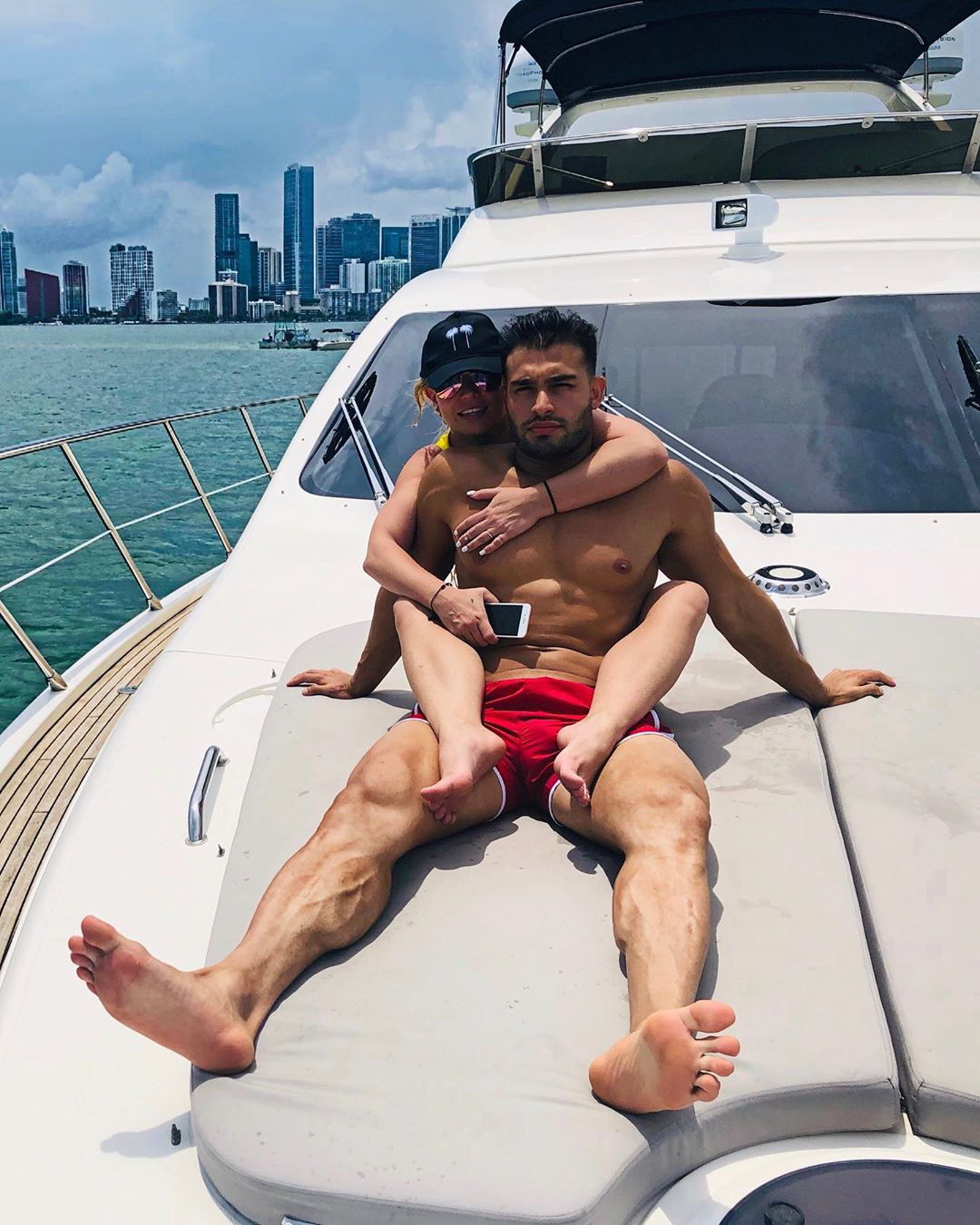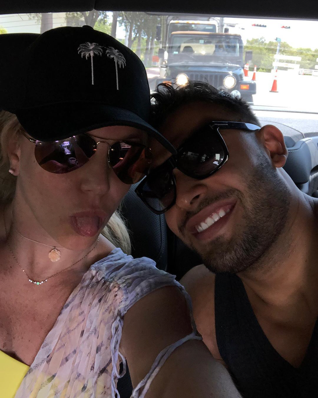 브리트니 스피어스와 샘 아스하리는 스피어스의 곡 '슬럼버 파티' 뮤직비디오 출연을 계기로 인연을 맺었으며, 지난 2017년 교제를 인정했다. 샘 아스하리는 모델 겸 피트니스 사업가로 알려져 있다.