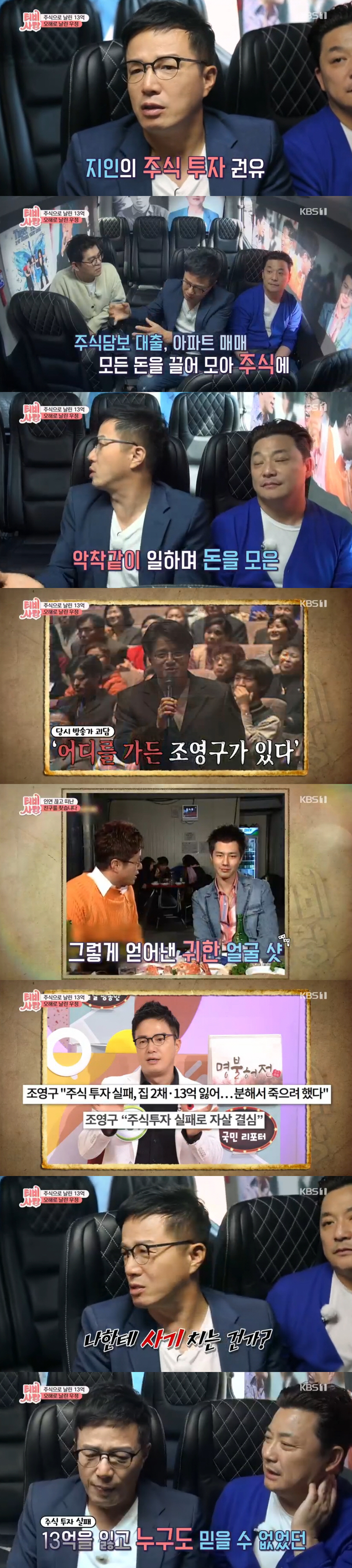 그러나 조영구는 무리한 주식 투자로 13억을 잃었다. 그는 "그 이후에 주식담보 대출과 아파트 매매 등 모든 돈을 끌어모아 주식 투자를 했다. 계속 무리수를 둬서 15억을 투자하고 남은 돈이 1억8천만 원이었다"며 "너무 억울해 죽고 싶었다"라며 당시 힘들었던 상황을 회상했다.