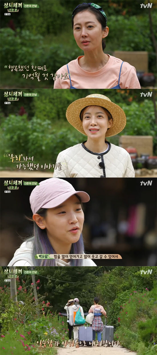 마지막으로 산촌 생활을 정리하며 염정아는 "맛있게 먹어줘서 너무 좋았다"라며 "행복했던 한 때로 기억될 것 같다"고 이야기했다. "벌써 3개월이나 됐어요?"라는 윤세아는 "소담이는 한결같이 예뻐해주고 잘 따라주고, 정아언니는 늘 좋고. '우리'라서 가능했던 이야기가 같다"고 이야기했다. 박소담은 "다 같이 모여서 밥먹는게 가장 기억에 남는다"라며 "다 내려놓고 힘을 많이 얻어가고 많이 웃고갈 수 있어서 너무 좋았다. 이 에너지로 다시 달려나갈 수 있을 것 같다. 행복하다"고 말했다. 염정아, 윤세아, 박소담은 마지막으로 정든 닭들과 작별인사를 나누고 산촌을 떠났다.