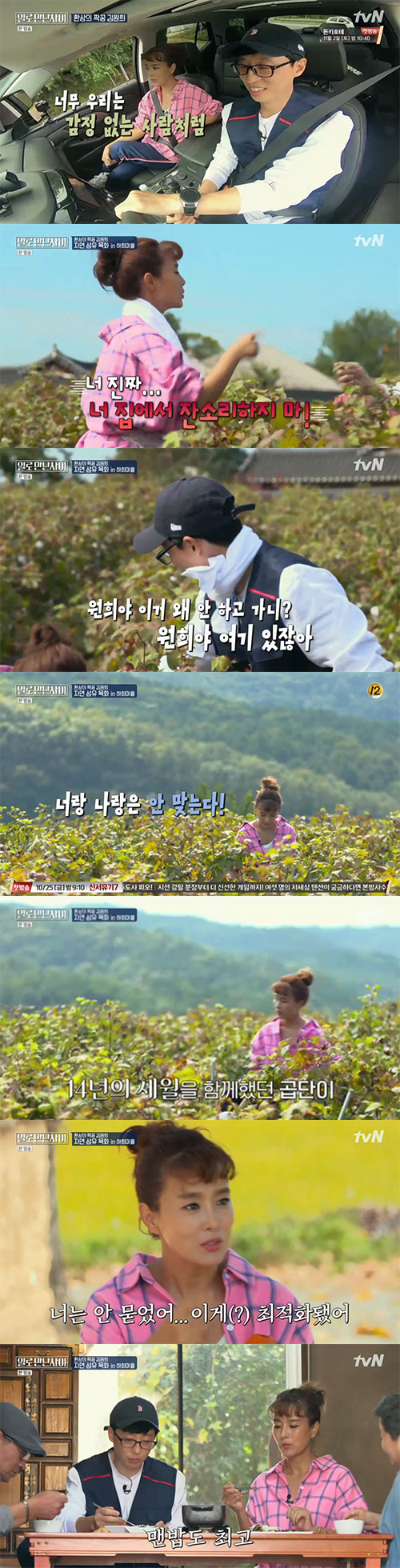 또 김원희는 유재석이 농사할 때 앉는 의자를 다리에 끼자 "볼썽사납다"라고 타박해 웃음을 자아냈다.