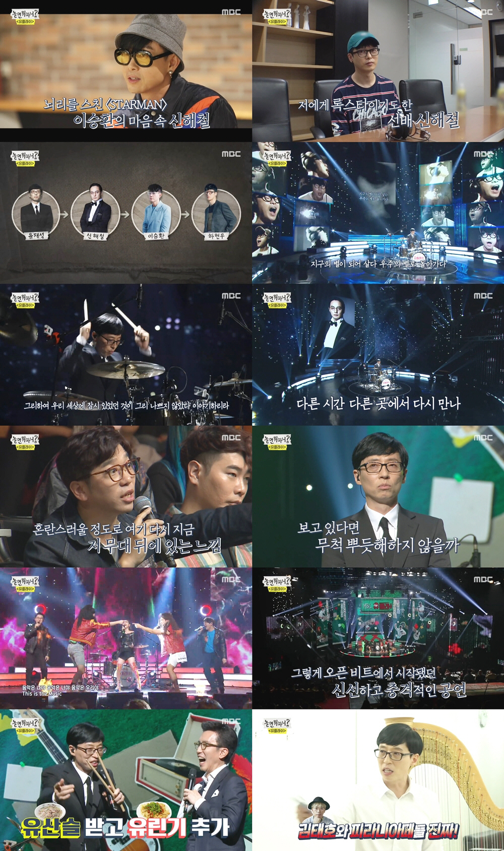 이날 방송에서는 유재석-신해철-이승환-하현우의 'STARMAN' 무대가 그려졌다. 지난 2014년 우리 곁을 떠난 故신해철과의 가슴 뭉클한 컬래버레이션 무대가 안방을 먹먹하게 만들었다. 유재석의 드럼비트에 신해철의 미발표곡이던 '아버지와 나 파트3'로 추정되는 신해철의 내레이션이 더해졌고, 프로듀싱을 맡은 이승환이 국카스텐의 하현우와 함께 보컬을 더해 감동의 'STARMAN' 무대가 완성됐다.