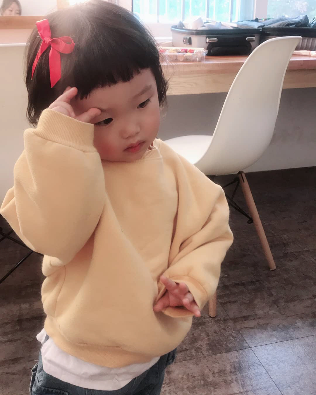 사진에서 나온은 아빠의 고백에 곤란한 듯 심각한 표정을 지으며 고민하는 듯한 깜찍한 포즈를 취해 웃음을 유발한다.