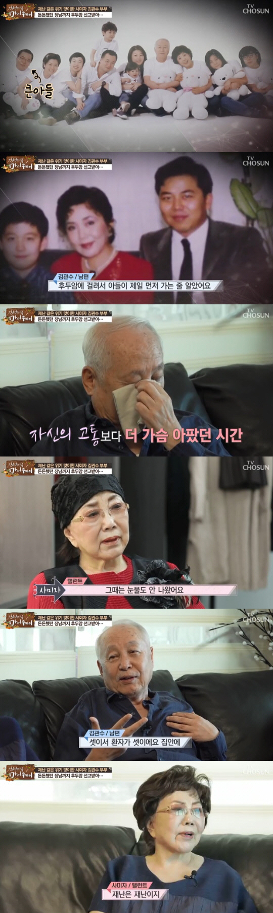 사미자 남편은 "그때는 진짜 사는 재미도 없었다. 한 7~8개월? 아내는 드러누워 있지, 큰아들도 아프지. 집안에 환자가 셋이었다"고 말했다. 이에 사미자는 "재난은 재난이다"라고 말했고, 남편은 "이제 다 지나간 것 같다"며 옅은 미소를 지었다.
