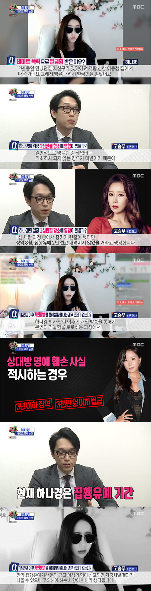 또 변호사는 "1심 판결이후 하나경 씨가 개인방송을 통해서 본인의 억울함을 토로하는 과정에서 상대방 명예 훼손 사실을 적시하는 경우 3년 이하 징역, 3천만원 이하의 벌금이, 허위사실을 적시하는 경우 7년 이하 징역 5천만원 이하 벌금이 나울 수 있다"며 "현재 하나경 씨가 집행유예 기간이기 때문에 만약 집행유예 기간 동안 금고 이상의 형이 선고되면 가중처벌 결과가 나올 수 있으니 주의해야 하는 사항이 아닌가 생각된다"라고 밝혀 눈길을 끌었다.