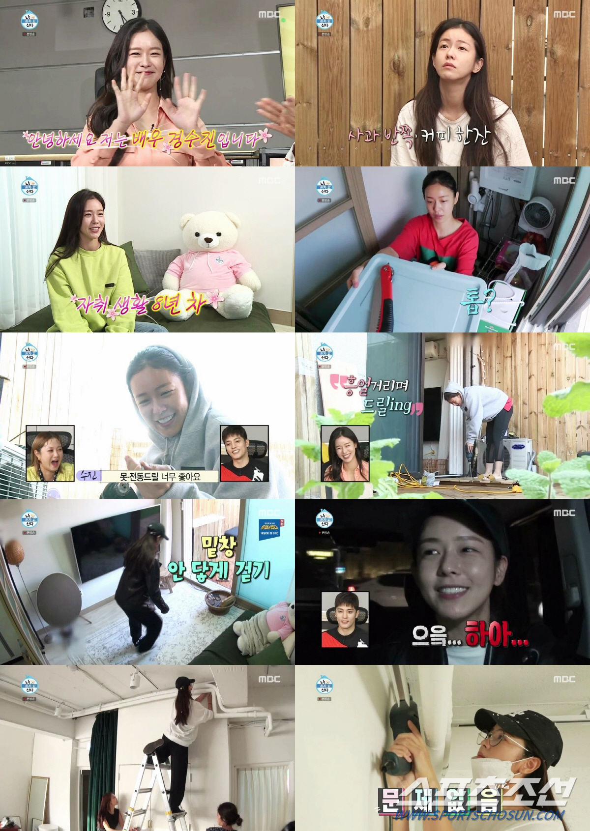 특히 목재소를 찾아가 가벽을 셀프 시공 하는 등 경수진이 만든 테라스는 특별한 공간이었다. 그는 무거운 인조잔디를 혼자 힘으로 마당에 깔았다. 이어 실외기 가림판을 만들며 행복한 미소를 지어 색다른 매력을 선사했다.