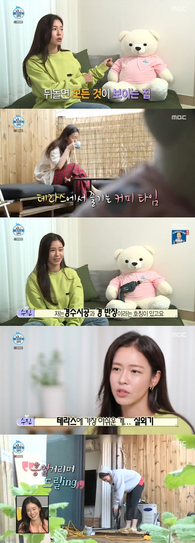 사과 반쪽과 테라스에서의 커피 한 잔으로 아침을 깨운 경수진은 테라스를 예리하게 훑어봤다. 경수진은 "경수시공과 경 반장이라는 호칭이 있다"며 "원래 테라스에 아무 것도 없었다. 옆집에도 벽이 없더라. 목재소까지 가서 나무를 하나 하나씩 드릴로 박았다"고 자신이 직접 가벽을 시공했다고 밝혀 놀라움을 자아냈다.