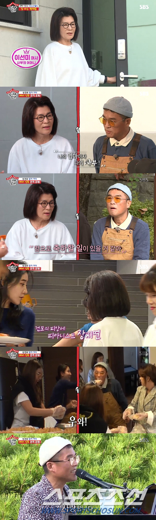 이를 들은 이선미 여사는 "김건모가 맨날 노는 거 같지만 안 보는데서 얼마나 열심히 노력하는지모른다. 천재의 별명은 노력가다"라며 아들 자랑을 했다. 또 이선미 여사는 "아버지가 돌아가시고 나서 건모가 가족에 대한 책임감이 더 커진 거 같다. 다 모여서 살자고 제안했다"며 "그래서 생각치도 않게 아들, 며느리와 살고 있다"며 고마움을 드러냈다.