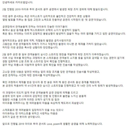 2일 진행된 2019 아이유 투어 콘서트 광주 공연에서 발생한 퇴장 조치 경위에 대해 말씀드립니다.
