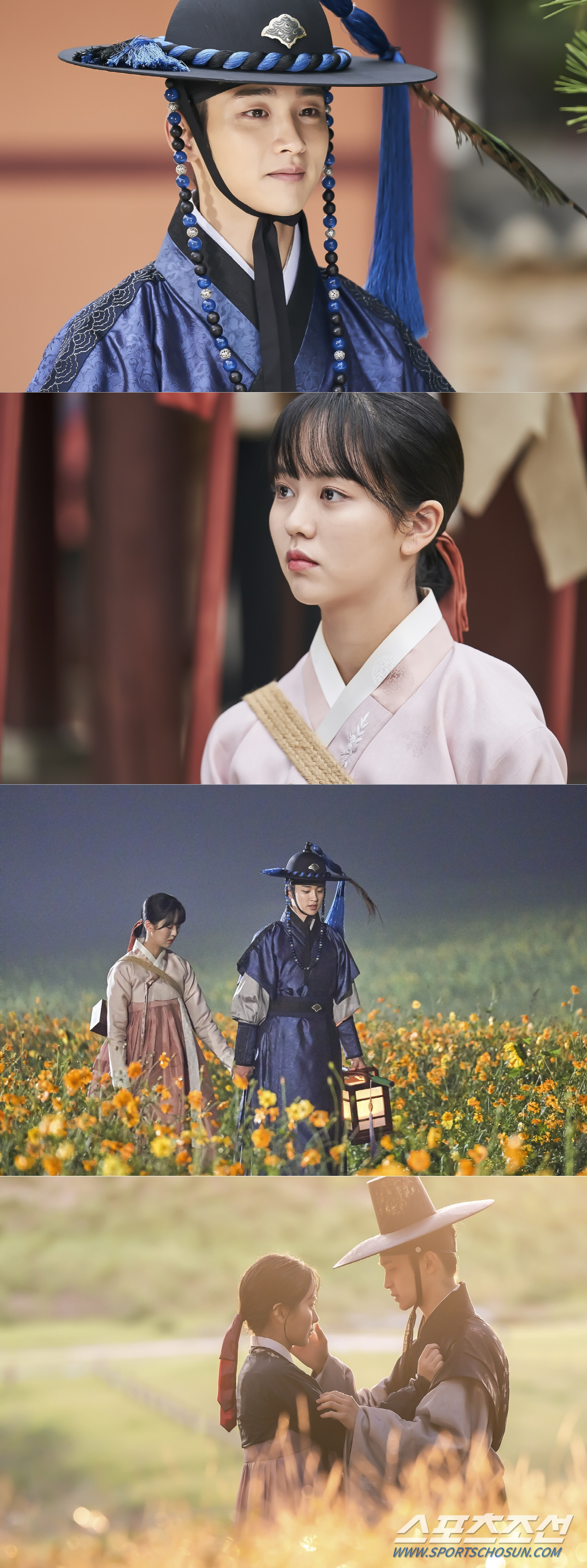 그런 가운데 공개된 사진에는 '동전커플' 녹두와 동주의 달달하고 아련한 달밤의 꽃길 데이트 현장이 담겨 있다. 얼굴 가득 피어난 미소 속에 설렘을 감추지 못하는 종사관 녹두의 모습이 시선을 사로잡는다. 녹두의 따뜻한 시선 끝에는 동주가 서 있다. 그와 마주 선 동주의 눈빛에서도 미처 숨기지 못한 애틋함이 흘러넘치는 듯하다.