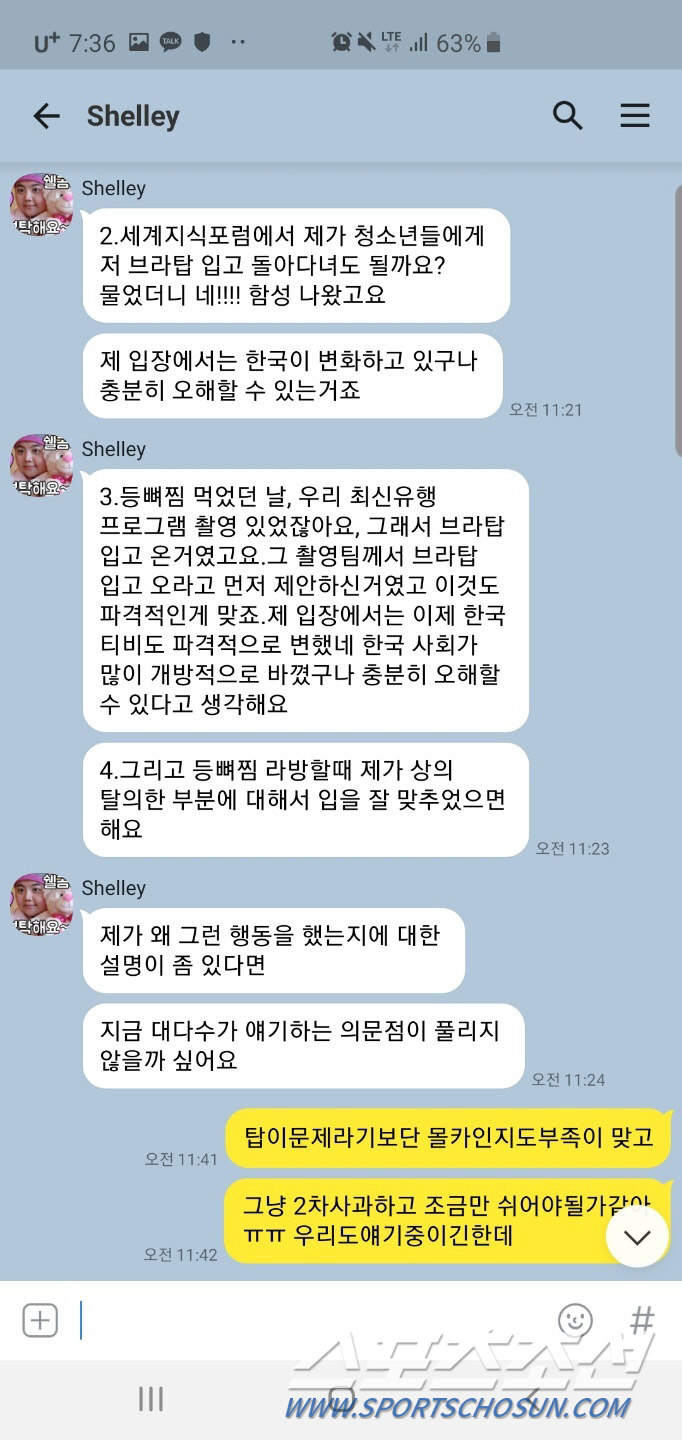 그러면서 권혁수는 구도 쉘리가 '최신유행프로그램' 방송 녹화 때문에 브라탑을 입으라는 요청사항을 받았다는 것을 잘 이해하고 있었다며 기자회견 자리에서 이를 증명하는 내용의 쉘리와의 카톡 내용을 읽어 내려갔다. 권혁수는 라이브 방송 논란 이후 쉘 리가 자신에게 보낸 카톡이라며 '오빠 우리 등뼈찜(먹방 라이브 방송) 먹은 날 최신유행프로그램 촬영이있었잖아요. 그래서 제가 브라탑을 입고 간거 였죠. 제작진이 그런 걸 먼저 제의한 것도 파격적이라고 생각해요. 등뼈찜 방송 할 때 상의 탈의한 부분에 대해서는 오빠가 입을 잘 맞춰졌으면 해요'라고 읽어내려 갔다.