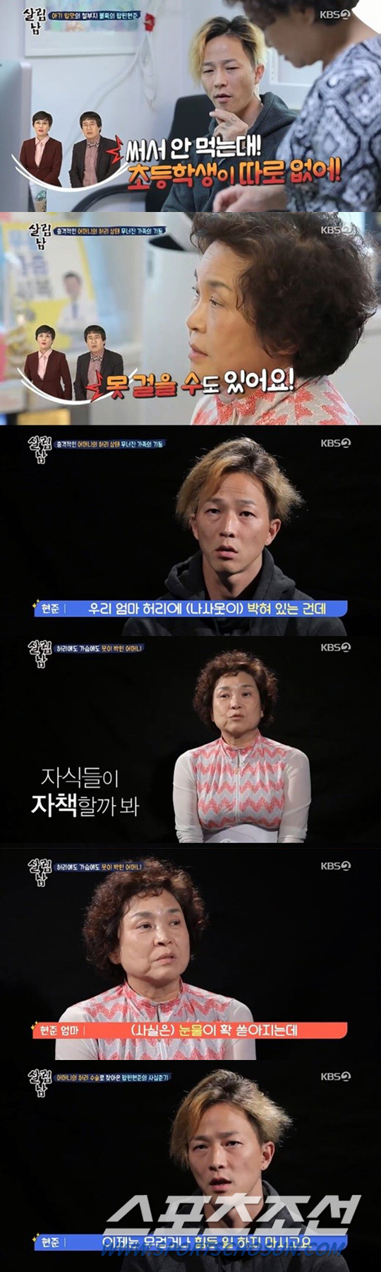의사는 "수술은 잘 됐다. 패혈증은 지나갔다. 그런데 고정된 수술부위는 평생 이용 못한다. 허리를 쓰면 안된다. 일하면 더 나빠진다. 3개월은 꼼짝도 하지마라. 평생 휠체어 탈수도 있다"고 경고했다. 검사 전 기계음에 맞춰 춤을 추던 팝핀현준의 표정도 굳었다. 그는 "뼈에 박힌 나사못을 보고 깜짝 놀랐다. 가슴이 철렁 내려앉았다. 내가 살림을 해야겠구나 싶었다"고 후회했다.