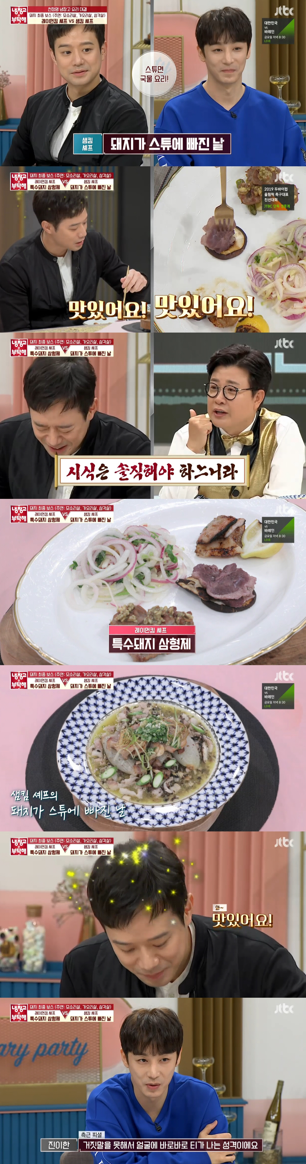 이어 샘킴 셰프가 '돼지가 스튜에 빠진 날'요리를 선보였다. 튀긴 양파로 싼 삼각살에 대해 천정명은 "와 맛있어요"라며 미소를 지었다. 하나의 요리지만 스튜는 세 가지 특수부위의 맛을 제대로 살렸다. 천정명은 "양파로 싸인 게 제일 맛있다"며 삼각살 부위를 최고로 꼽았다. 천정명은 감탄사를 연발했다. 진이한은 "천정명은 거짓말을 못해서 얼굴에 바로바로 티가 나는 성격"이라며 "진짜로 맛있어 하는 것"이라고 거들었다. 승자는 레이먼킴이었다. 천정명은 "본연의 맛을 느꼈다. 내 취향에 맞았다"며 이유를 전했다.