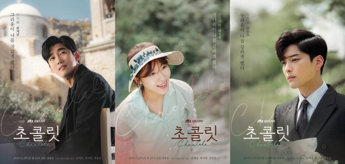 '나의 나라' 후속으로 오는 11월 29일 첫 방송되는 JTBC 새 금토드라마 '초콜릿'(연출 이형민, 극본 이경희, 제작 드라마하우스·JYP 픽쳐스) 측이 12일 윤계상, 하지원, 장승조의 캐릭터 포스터를 공개했다. 각각의 키워드로 담아낸 세 가지 색의 감성이 궁금증을 자극한다.