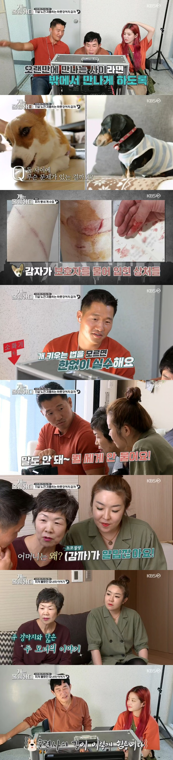 모니터링을 통해 분석한 결과, 보호자 모녀의 행동에 문제가 있었다. 심지어 보호자가 싸움을 부추겨서 두 강아지들이 싸우는 경우도 있었다. 이를 본 강형욱은 한숨을 쉬며 "개 키우는 법을 모르면 한 없이 실수할 수밖에 없다"고 말했다. 이에 경규는 "(훈련) 방법이 있는지?"라며 강형욱을 걱정하는 모습을 보이기도 했다.