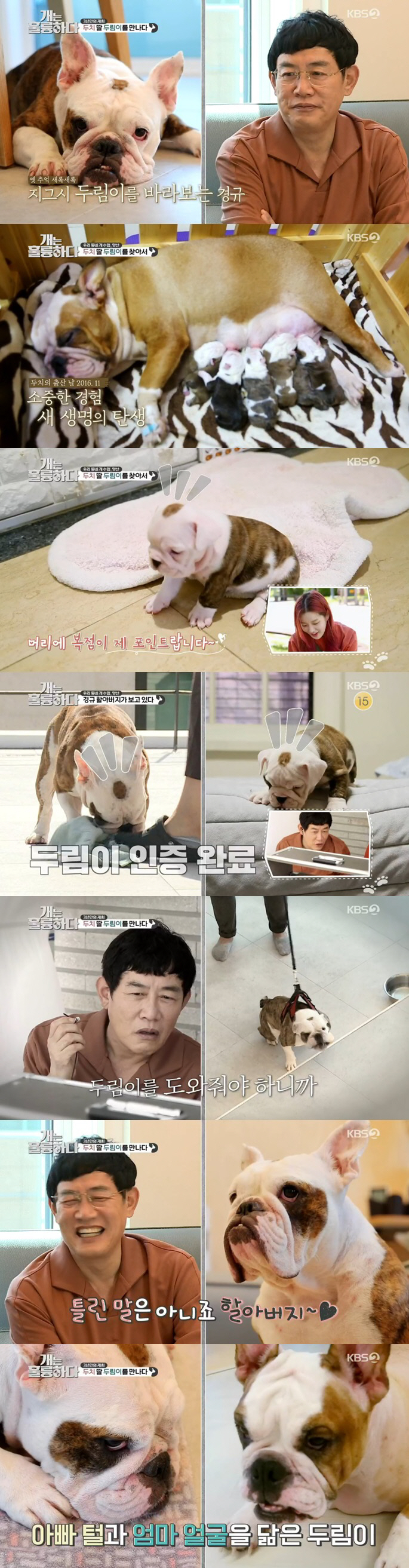 지난 2016년, 이경규의 딸과도 같은 반려견 잉글리쉬 불독 '두치'가 8마리의 새끼를 출산했고 방송을 통해 새끼들의 입양을 진행했다. 그때 입양 보냈던 한 마리가 바로 손녀 '두림이'였다. 이경규는 "한달 간 8마리의 강아지가 골고루 젖을 먹게끔 돌봐줬다"고 당시를 회상했다.
