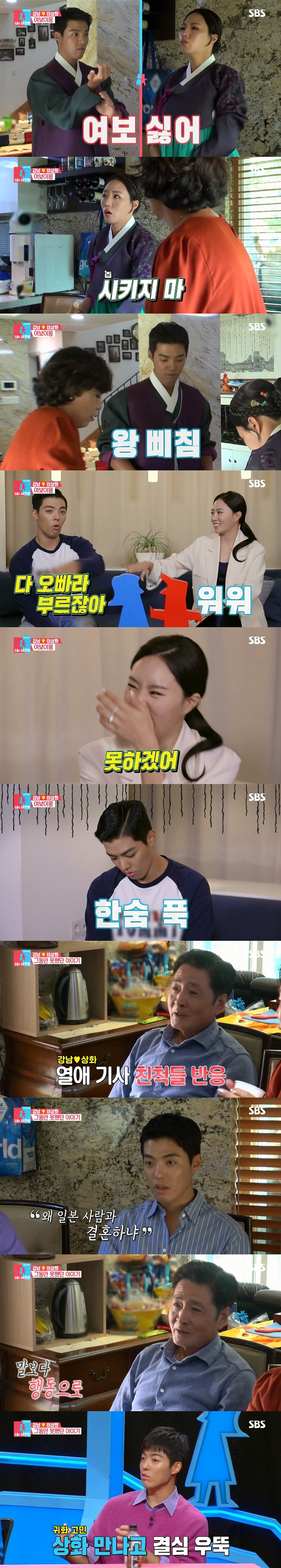 강남과 이상화는 호칭을 두고 '동상이몽'을 보이기도 했다. 강남은 "오늘부터 '여보'라고 해봐라"고 했지만 이상화는 '여보' 호칭에 질색팔색한 것. 강남은 "이 사람 저 사람 다 '오빠'이지 않냐?"며 자신만 불리고 싶은 특별한 호칭을 원했고 '여보' 호칭이 어색한 이상화는 계속해서 강남의 호칭을 거부해 보는 이들을 배꼽잡게 만들었다.