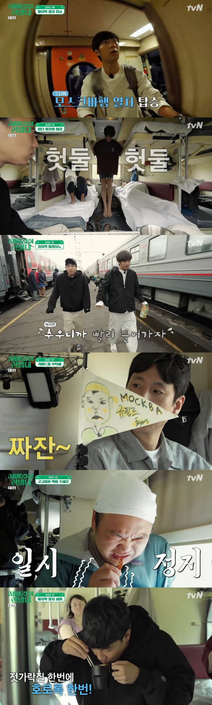 아침거리를 사자 다시 출발한 열차. 가는 길에 배우들은 눈물 연기에 대해 이야기했다. 김민식은 "나도 잘 못 운다. 하정우에게 우는 연기에 대해 물어봤는데 제품이 있다더라. 손에 제품을 살짝 묻힌 뒤 눈에 바르라고 했다"고 하정우만의 꿀팁을 공개했다.
