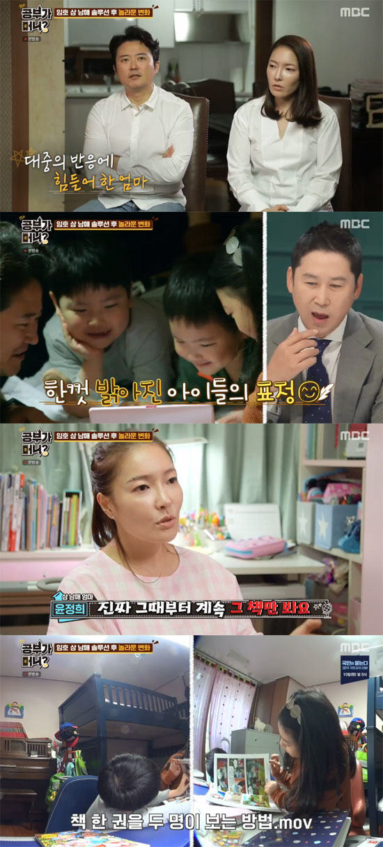 한편 사교육 대신 아이들의 성향에 따라 일대일로 맞춤형 케어를 시작한 엄마 윤정희의 모습이 공개됐다. 일부러 오답을 적었던 지범은 적극적으로 공부에 임하는 변화가 포착됐다. 엄마 윤정희는 주도적 학습형인 지범을 위해 맞춤형 학습법을 끈임 없이 고민했다.