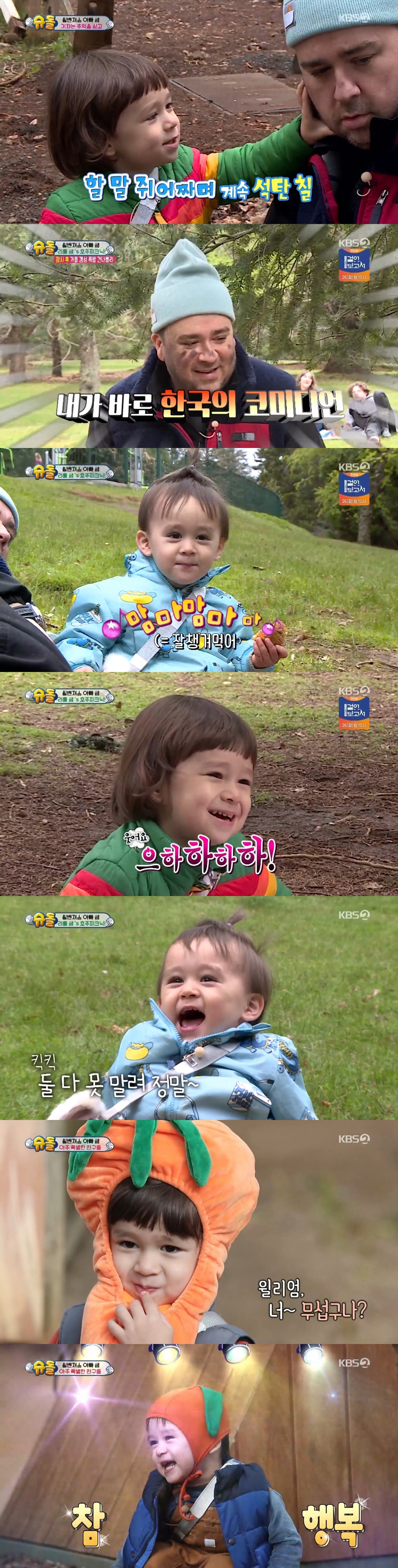 윌리엄의 개그 본능은 여기서 멈추지 않았다. 언제나 남다른 어휘력으로 감탄을 자아내는 윌리엄이 자신감 넘치는 영어로 시청자들의 배꼽을 스틸한 것. 피크닉 중 또래 친구가 있는 호주 가족을 발견한 윌리엄은 그들에게 자신 있게 아빠를 소개하며 "저 사람(샘) 오스트레일리아 사람", "마이 대디 토크 사람들이 으하하하" 등 재치 있는 문장들을 만들어 랜선 이모-삼촌들의 웃음 지수를 수직 상승시켰다.