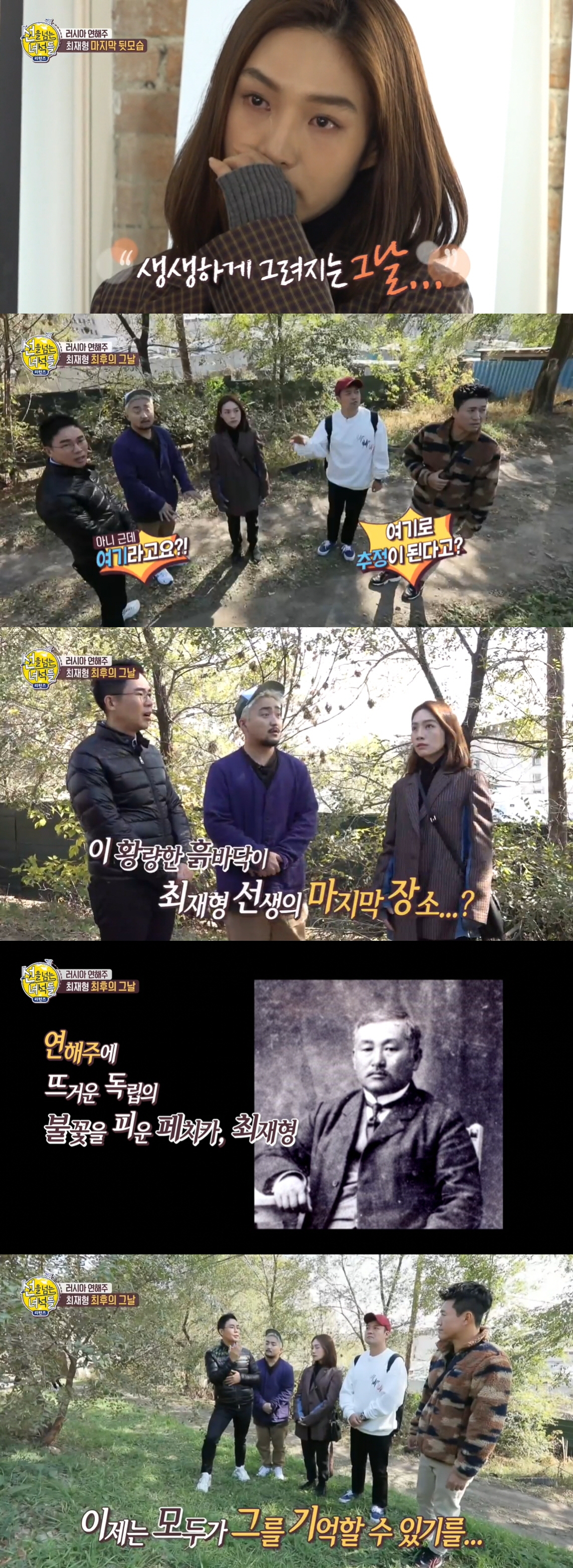 이러한 최재형 선생의 마지막은 설민석, 최희서 등 '선녀들'의 눈물을 쏟게 했다. 그의 순국 장소는 러시아 우수리스크 감옥 뒤 황량한 길바닥. 일제가 최재형 선생의 유해를 못 찾게 하기 위해 봉토도 없이 일부러 길바닥에 묻은 것이다.