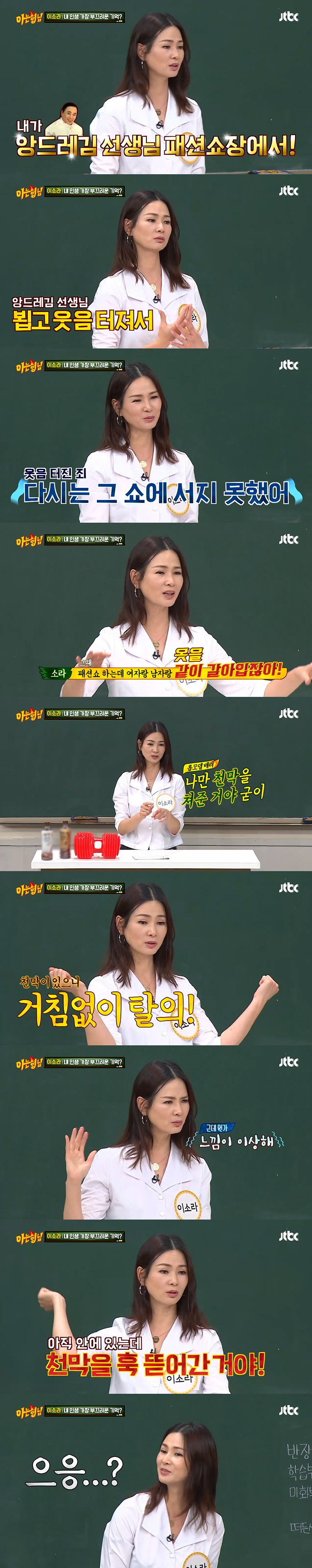 이에 이상민은 "이소라는 웃음을 못 참는다"면서 "패션쇼를 하며 워킹을 하는데 앞에 지인이 보여 웃음보가 터진 것 아니냐"고 말했다. 그러자 이소라는 "비슷한 경험은 있었지만 정답은 아니다"며 과거 앙드레김 패션쇼에서 겪은 기억을 떠올렸다.