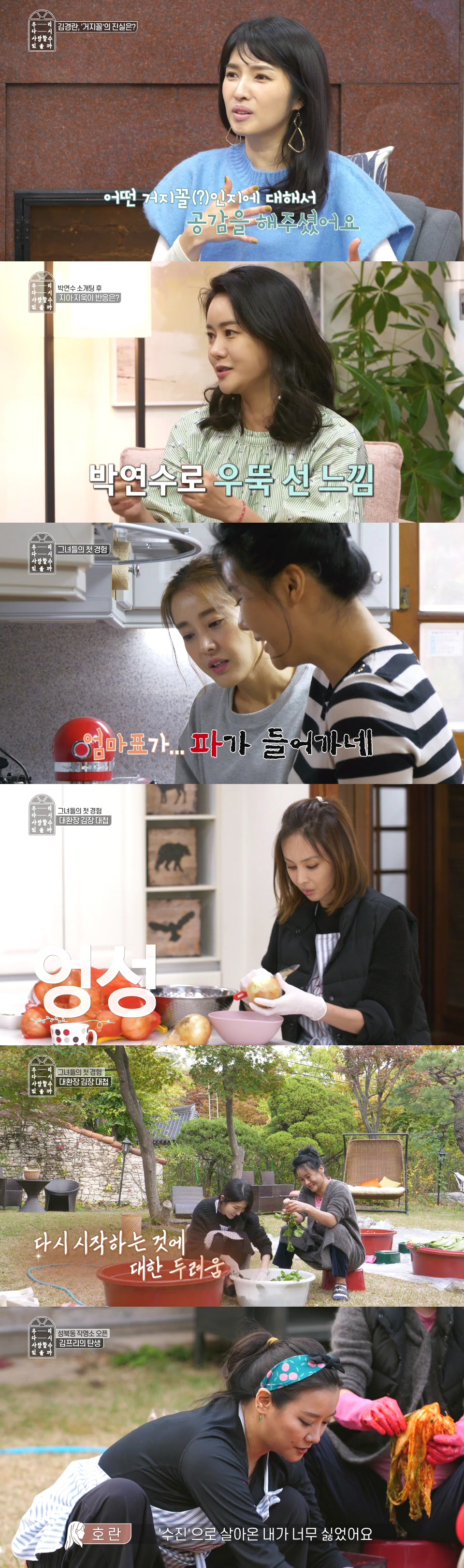 모든 김장이 끝난 후 멤버들은 '수육 한 상'과 함께 이상형 토크를 나눴다. 차태현과 쿨의 이재훈, 하정우, 강하늘, 오대환 등 다양한 인물이 소환된 가운데, 박은혜는 "내가 바뀌어야 만나는 사람도 달라진다"며 뼈 있는 발언을 남겼다. 마지막으로 이들은 이혼한 여주인공이 홀로 사춘기 아들을 키우는 영화 '우리의 20세기'를 감상했다. 주인공과 비슷한 상황으로 인해 영화를 본 날 침대에서 밤새 울었다는 박영선은 "아들에게 내가 '엄마'가 아닌, 아는 어른이 되어가는 기분"이라며 속상함을 전했다. 박연수는 "지욱이가 크면서 엄마의 역할로는 한계가 있어, 주말마다 (남자 어른 역할을 해줄) 친한 형부에게 보내기 시작했다"며 남모를 고민을 드러내기도 했다.