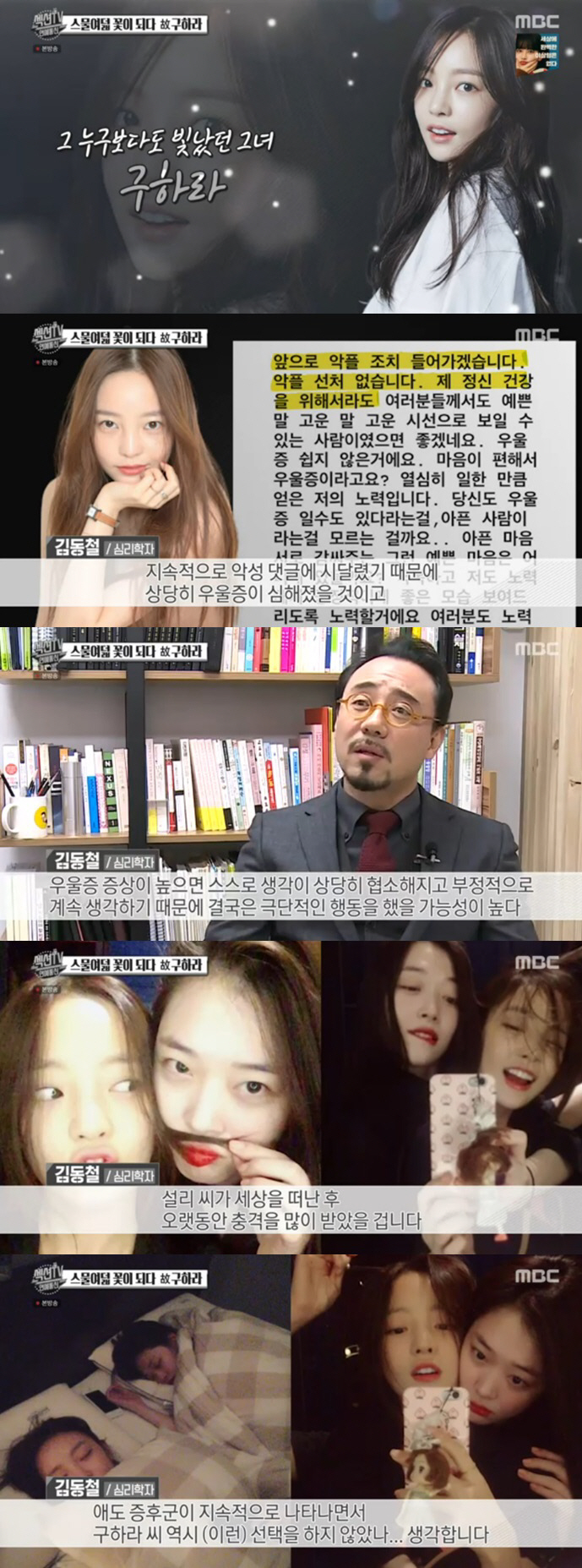 그녀는 지난 5월 극단적인 시도로 많은 이들을 안타깝게 하기도 했다. 생전 루머와 악성댓글 등으로 인한 고충을 털어놨던 구하라. 한 심리학자는 "지속적으로 악성댓글에 시달렸기 때문에 상당히 우울증이 심해졌을 것이다. 우울증 증상이 높으면 스스로 생각이 상당히 협소해지고 부정적으로 계속 생각하기 때문에 결국은 극단적인 행동을 했을 가능성이 높다"며 "또 설리씨가 세상을 떠난 후 오랫동안 충격을 많이 받았을 것이다. 애도 증후군이 지속적으로 나타나면서 구하라씨 역시 (이런) 선택을 하지 않았나 생각한다"고 전했다.