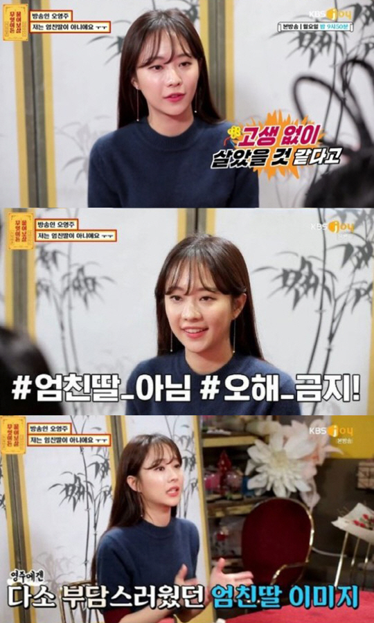 오영주는 "'하트시그널2' 이후 '엄친딸'(엄마 친구 딸) 같다고 하더라. 포털에 제 이름을 치면 연관 검색어가 '집안'이다. 미국 유학도 했으니 집안이 좋고 똑 부러질 것 같다, 고생 없이 살았을 것 같은 이미지"라며 "실제로는 그렇지 않다. 오해를 풀고 싶다"고 밝혔다.