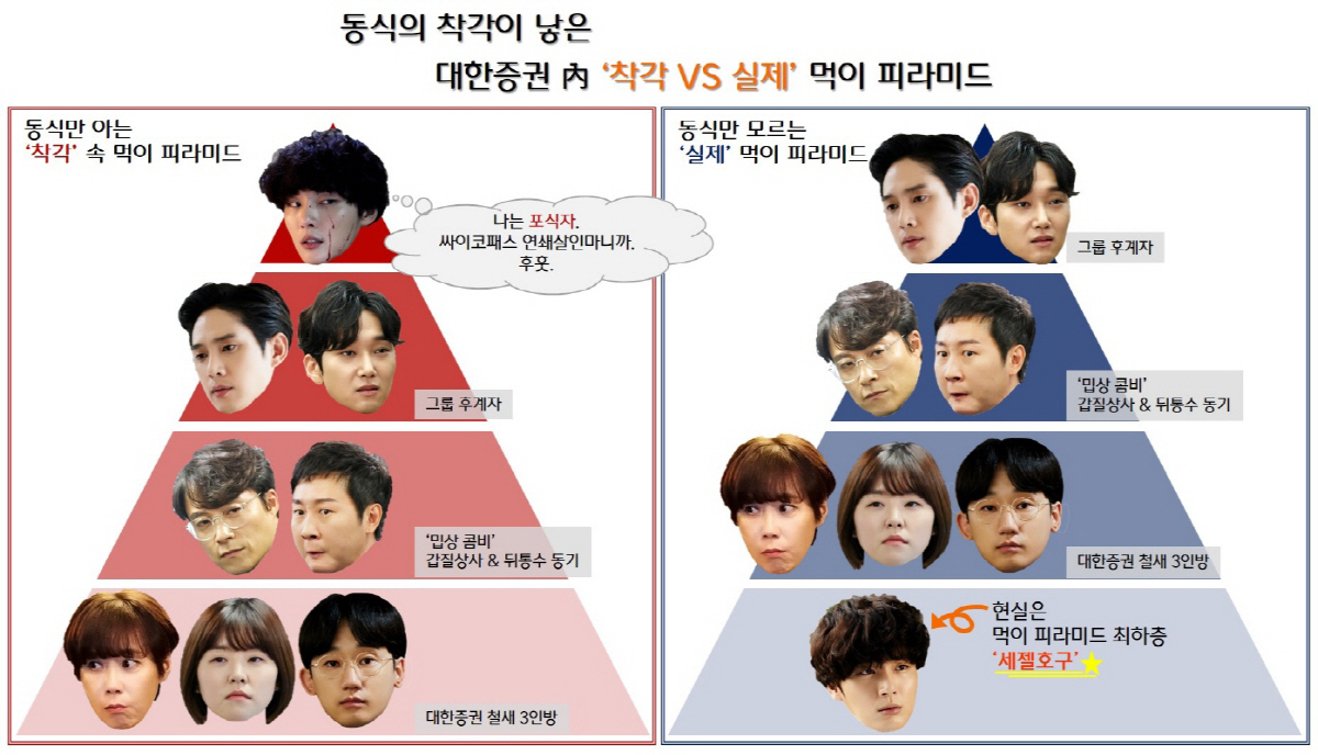 이 가운데 두 개의 대한증권 먹이 피라미드가 공개돼 눈길을 끈다. '동식만 모르는 실제 먹이 피라미드'에서 동식은 최하층에 위치하는 세젤호구(세상 제일의 호구), 만년 '을'의 입장이다. 이에 서지훈(유비 분)과 '밉상 콤비' 공찬석(최대철 분)-박재호(김기두 분)는 자신들이 저지른 비리를 동식에게 모두 뒤집어 씌우는가 하면, '철새 3인방' 한정아(조시내 분)-오미주(이민지 분)-신석현(최태환 분)조차 그를 방패로 삼았을 정도.