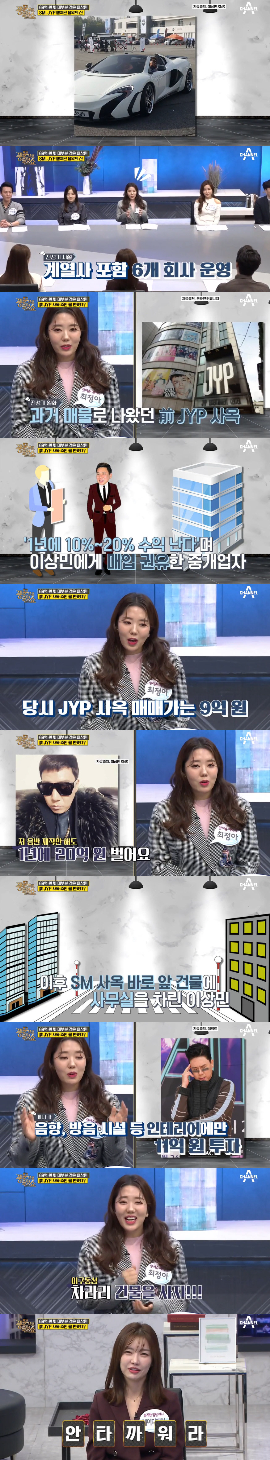 이어 "그 중 가장 기억에 남는 얘기가 있다. 과거 JYP 사옥이 매물로 나왔던 적이 있었다. 이때 부동산에서 이상민에게 건물을 사라고 권하며 '무조건 수익이 1년에 10%에서 20%는 얻을 수 있다'고 했다더라. 그 당시 JYP 사옥 매매가는 9억 원이었다"고 전했다. 하지만 이상민은 건물을 살 수 있는 능력이 있었음에도 구매를 하지 않았다.