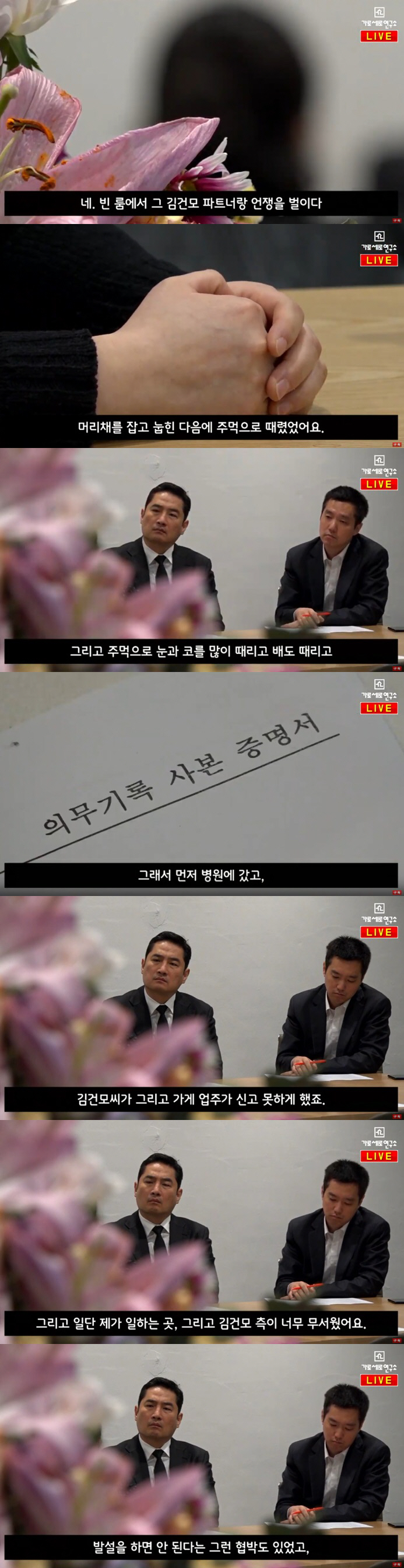 이어 B씨는 '왜 사건 당시 경찰에 신고를 안했냐'는 질문에 "일단 피가 나니까 무서워서 병원에 먼저 가서 진단을 받고 진단서를 끊어야 겠다고 생각했다"면서 "그런데 다음날이 되니, 김건모와 가게 업주가 경찰에 신고를 못하게 했다. 제가 경찰에 신고한다고 한들 신고 할수도 없었고, 지인 중에 '변호사 소개시켜줄게'라고 말하는 사람도 없었다. 제가 일했던 곳, 김건모 측이 너무 무서웠다. 발설을 하면 안된다는 협박도 있었다. 소문은 소문대로 다 나서 일 할 수가 없었다. 그래서 다른 일을 찾았다"고 밝혔다.